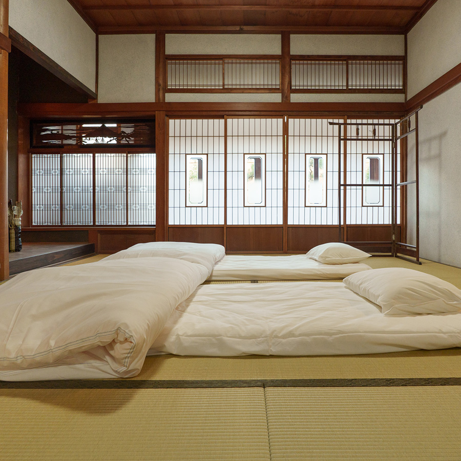 和室で畳に布団を敷いて眠る——都会ではなかなかできないその体験を、ここではゆっくり楽しんでいただけます。床に近い目線で過ごすことで、空間の広がりや木の温もりをより身近に感じていただけます。い草の香りに包まれながら目を閉じると、ふだんより深く眠れる気がします。翌朝、布団を畳んで窓を開ければ、庭の空気が流れ込んでくる。そういう朝の始まりが、旅の中でいちばん気持ちいい時間かもしれません。畳の調湿性と相まって、四季を通じて快適にお休みいただけます。